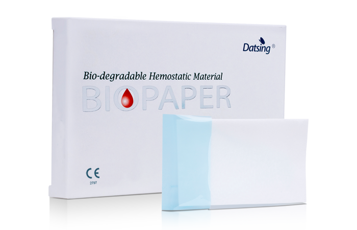 Biopaper ? is a new type patented bio-degradable hemostatic material. Adjunctively used in surgical procedures. It can effectively stop blood oozing in surgical wounds, prevent the tissue from adhering, and seal the surgical wound.